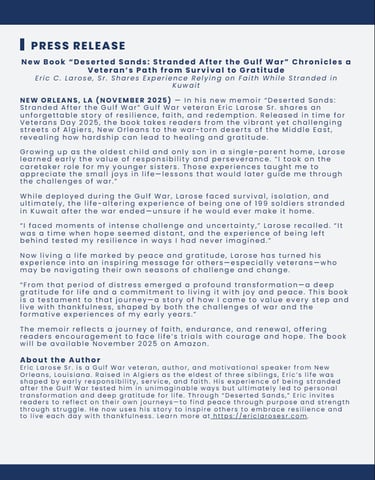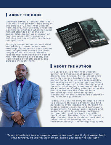 My name is Eric Larose, and this book is the story of my journey—a journey that began in the vibrant yet challenging neighborhood of Algiers in New Orleans, Louisiana, and took me through the chaos of the Gulf War to a life now marked by peace and gratitude.